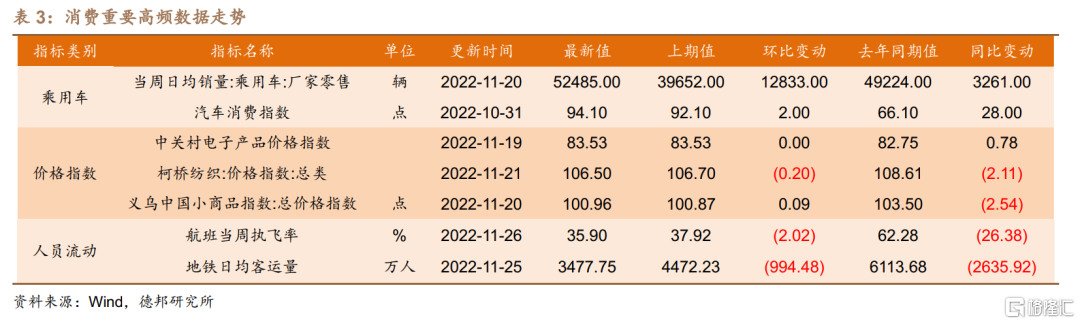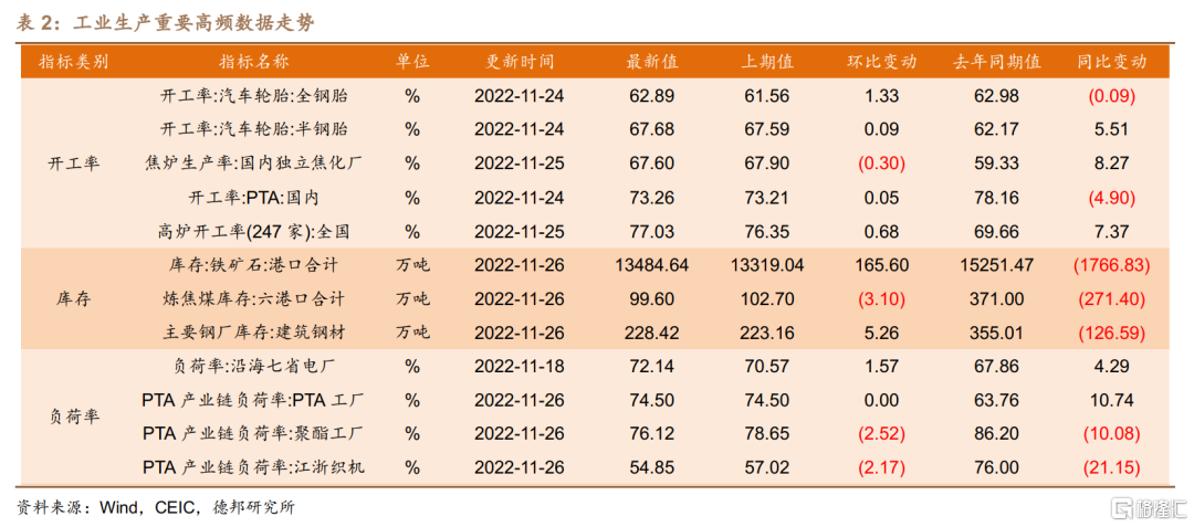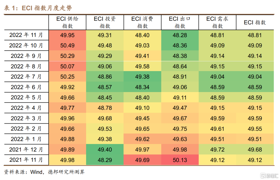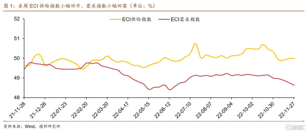 · 周度ECI指數::從周度數據來看,截止2022年11月27日,本周ECI供給指數為50.00%,較上周回升0.02;ECI需求指數為48.63%,較上周回落0.13%。從分項來看,ECI投資指數為49.10%,較上周回落0.25%;ECI消費指數為48.11%,較上周回落0.11%;ECI出口指數為48.35%,較上周回升0.12%。