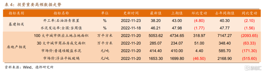 基建投資方面,11月23日石油瀝青裝置開工率錄得38.20%,環比回落4.80%;11月18日全國水泥發運率錄得46.21%,環比回落1.77%。