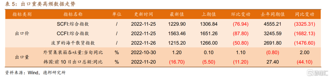 出口數量方面,10月下旬主要港口外貿集裝箱吞吐量同比回升1.20%;韓國11月前20日出口金額同比回落16.70%,表明歐美經濟體的需求正逐步回落。