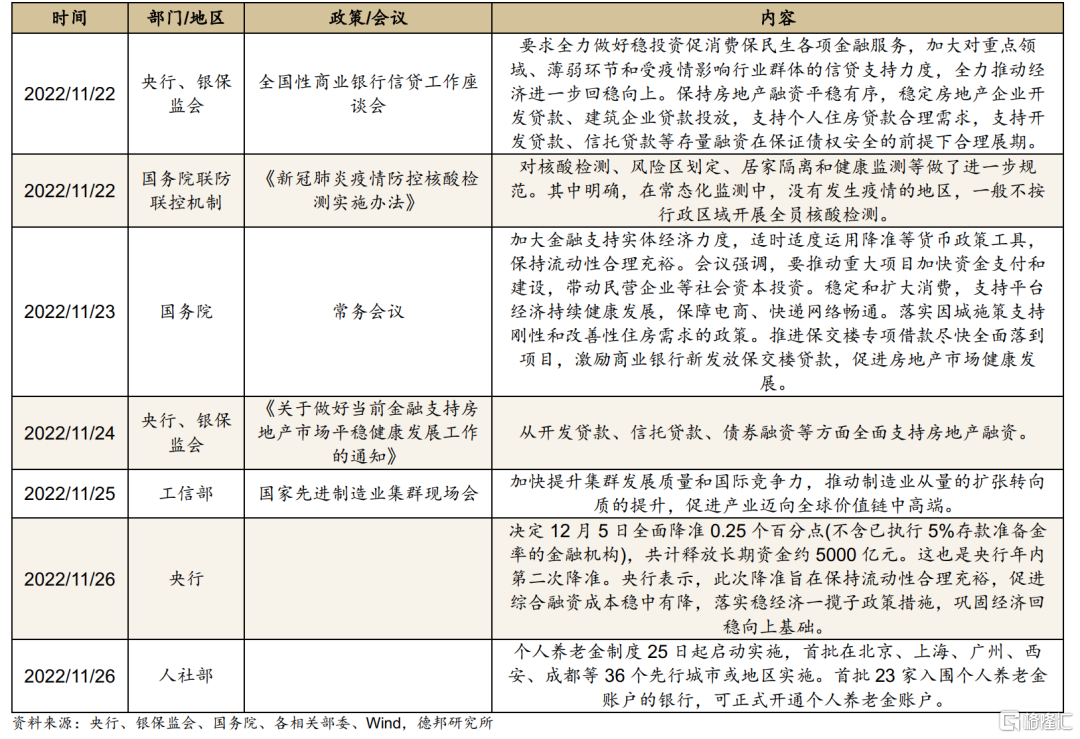 全面「降準」或打開利率政策「降息」空間。11月25日,央行宣佈將於2022年12月5日全面下調金融機構存款準備金率0.25個百分點(不含已執行5%存款準備金率的金融機構),共計釋放長期資金約5000億元,本次「降準」是對11月22日國常會提出要「適時適度運用降準等貨幣政策工具,保持流動性合理充裕」的具體落地,在8月份「降息」之后,時隔3個月總量政策工具再次加碼,顯現貨幣政策維持流動性寬松和信用擴張的決心。在本次「降準」落地之后,利率政策空間也隨之打開:(1)11月22日國常會提出「引導銀行對普惠小微存量貸款適度讓利」,意味着除了新增貸款執行當前較低的貸款利率之外,存量貸款利率也有繼續壓降的空間,根據央行披露的數據,截至9月末,普惠小微貸款余額達到23.2萬億元,結合銀保監會7月份披露的數據,2022年上半年全國新發放普惠型小微企業貸款利率為5.35%,2021年全年則是5.70%,如果存量貸款全部執行9月末企業貸款加權平均利率4.0%,那麼可以為小微企業節約3132億元利息支出;(2)11月份全面「降準」打開了12月份LPR報價的下調空間,參考央行在2020年9月15日《中國貨幣政策執行報告》增刊中的説法:「LPR改革后中國人民銀行分別於2019年9月和2020年1月兩次降低法定準備金率各0.5個百分點,帶動報價的算術平均值下行了0.02-0.03個百分點,但因為變動小於LPR的最小調整步長,向0.05%就近取整后,兩次降準當月只有一次觸發了LPR變化。」從經驗值上估算,大約降準1個百分點給商業銀行帶來的成本節約,可以觸發LPR報價下調5bps,今年以來,4月份全面降準0.25%、11月份全面降準0.25%、上繳利潤1.1萬億等同於全面降準0.5%,全年已經有1%的降準幅度,12月份LPR報價有下調5bps的空間,12月份或重演5月份,在「降準」落地之后,5年期以上LPR報價單獨下調5-10bps。