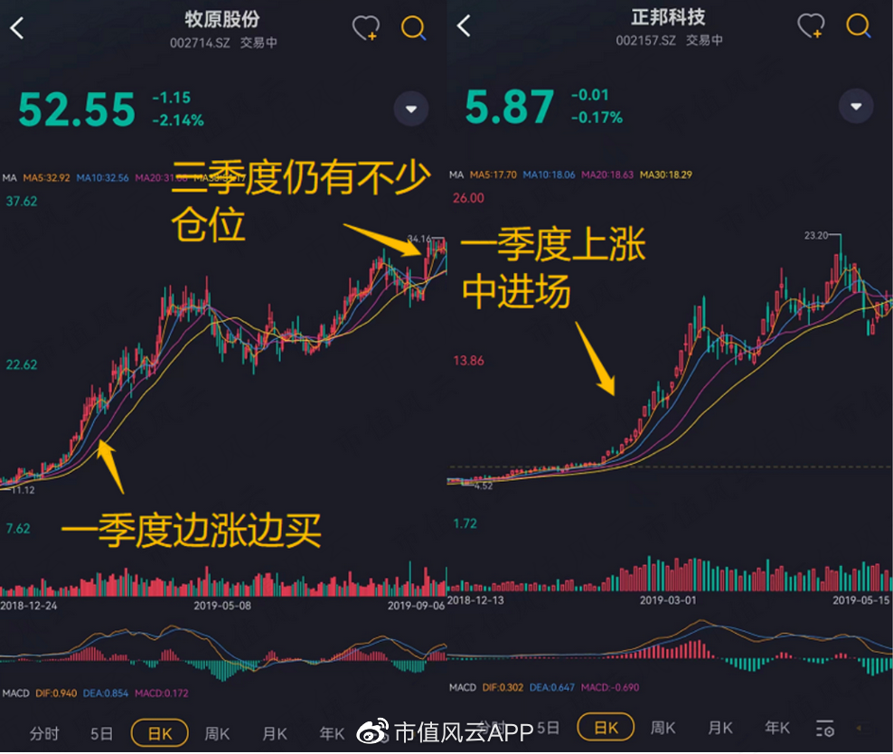 正邦科技持有至2019年三季報就快速減倉,而牧原股份一直持有至今。