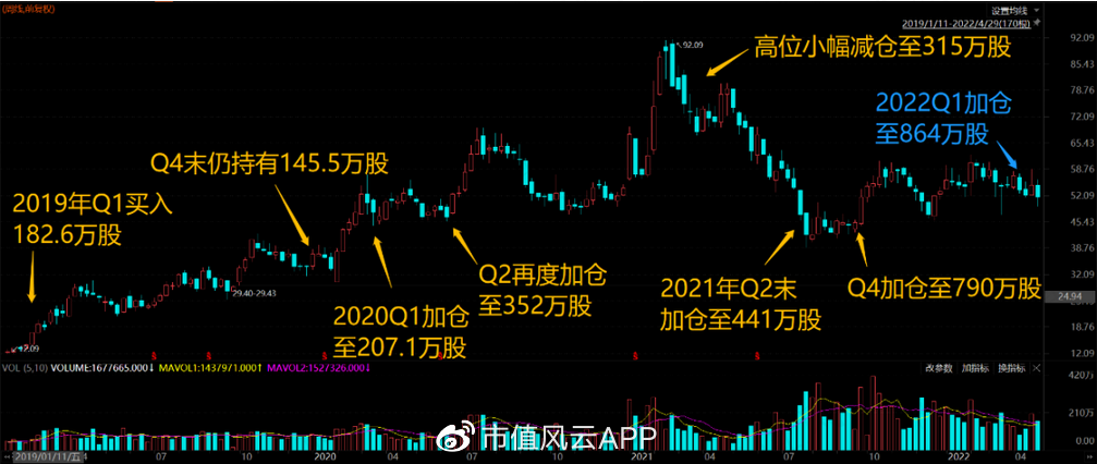 后來,牧原股份快速回調,接近腰斬,杜猛再度大手筆加倉,從2021年Q1的315萬股增加至2022年Q1的864萬股,為第三大重倉股,持倉市值達4.9億元,2022年Q3持股不變,市值下滑至4.7億。