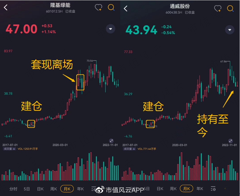 舉兩個例子,杜猛在2018年Q4建倉隆基股份和通威股份,成本價大約是16.6元/股和7.63元/股(前復權價),當時建倉的隆基股份直至2021年Q1才大幅減倉,通威股份一直持有至今。
