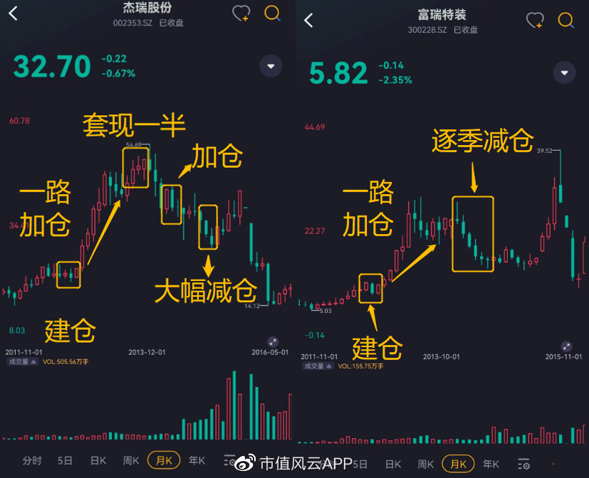 然而,總體來看,這兩筆操作都不算成功。杜猛在2家公司的建倉位置很精準,並隨着股價大漲一路加倉,在傑瑞股份的股價頂部減持一半倉位,但在回調時再度加倉,在富瑞特裝則逐季減倉。