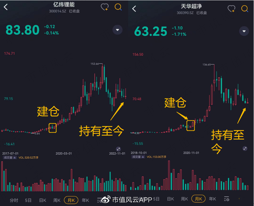 杜猛也非常看好新能源車板塊。在2019年Q2以平均約26.6元/股(前復權價)建倉億緯鋰能,在2020年Q4以平均19.9元/股(前復權價)建倉天華超淨,2只股票均持有至今,收益早已翻幾倍。