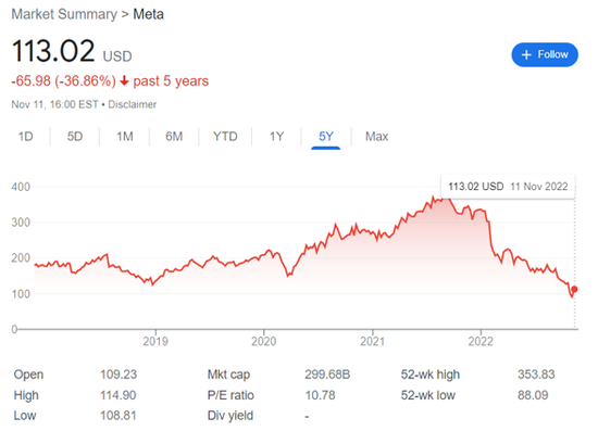 2022年10月27日,Meta發佈了2022年第三季度財報。美股盤后,Meta股價暴跌了近20%,這使得Meta的市值在一天之內蒸發了800億美元。2022年以來,Meta的股價已經跌去了超過60%。