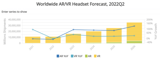 根據IDC的數據,2022年第二季度全球VR頭戴設備同比增長32%,Meta繼續以86%的份額保持市場領先地位,而中國的Pico(2021年被Tik Tok母公司字節跳動收購)擁有8%的市場份額。鑑於當前的宏觀背景,預計2022年全球銷量將保持平穩,IDC預測到2026年的總出貨量將從2022年的1080萬台增加到3100萬台。