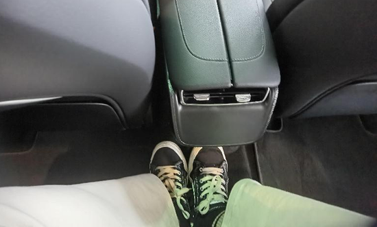 除此之外,EQE的后排中間略有隆起。中間座椅也是座墊偏短,材料偏硬,而兩排的座椅材料軟。如果乘客坐在中間座椅,中部地臺會很擠腳。爲了舒服一些,只能雙腳岔開,放到左右座椅下方,乘坐體驗大打折扣。