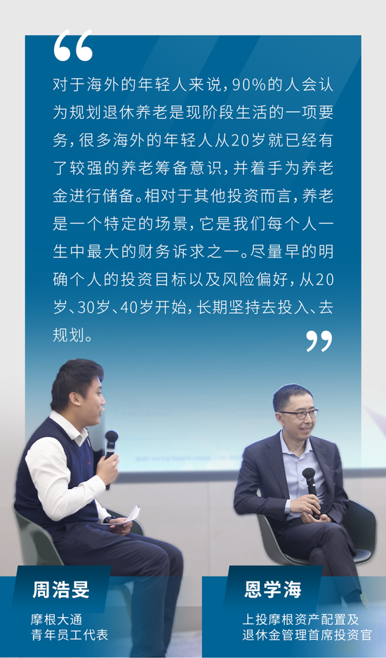 來自摩根大通的90后代周浩旻,與上投摩根資產配置及退休金管理首席投資官恩學海,由他們自己親身經歷的視角,從養老意識的建立、如何確定養老目標並開啟養老投資等角度進行了一場別開生面的‘養老理念大碰撞’。