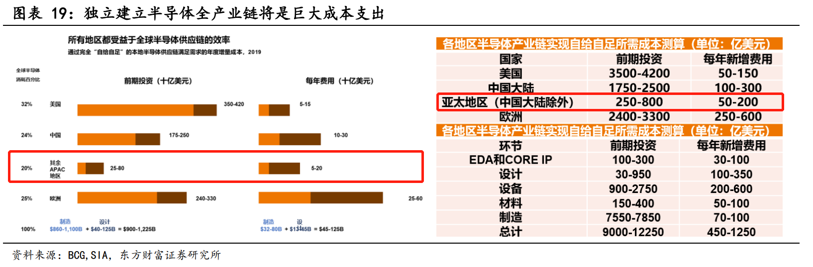 如今,東南亞正成為芯片巨頭押注的寶地。東南亞具有獨特的中立區域定位,在全球半導體生產線和供應鏈中發揮重大作用,並深度融入全球價值鏈。東方財富證券分析師曲一平11月22日發佈的研報指出,測算各地區半導體產業鏈實現自給自足所需成本,亞太地區(中國大陸除外)前期投資擁有最大優勢,每年新增費用也相對較低。