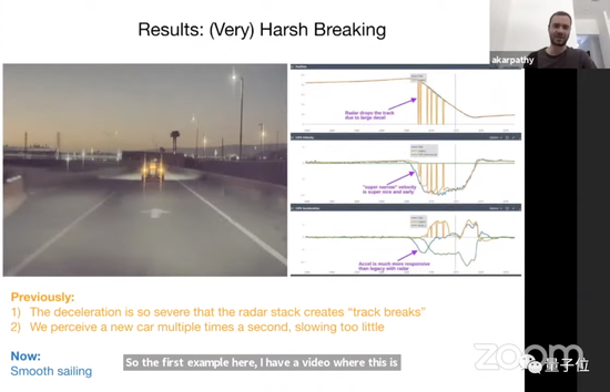 毫米波雷達無法確定前方物體是否靜止,任務交給視覺傳感器,110米的距離得出判斷。而純視覺方案則可以做到在180米距離作出判斷,並在145米開始減速。
