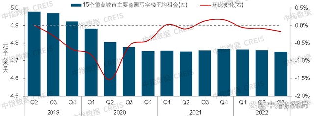 據中國房地產指數系統寫字樓租金指數調查數據,2022年三季度,全國重點城市主要商圈寫字樓平均租金為4.75元/平方米/天,環比下跌0.17%。從不同商圈表現來看,二季度寫字樓租金環比上漲的商圈佔16.3%,租金環比下跌的商圈佔78.8%,5.0%的商圈租金環比持平。這是全國重點城市主要商圈寫字樓平均租金連續三個季度下跌。