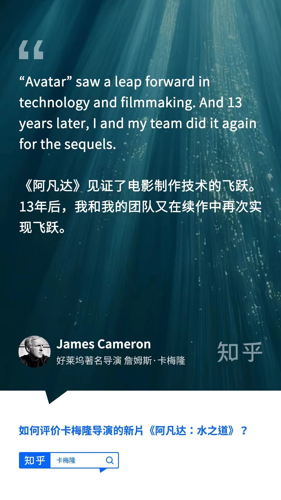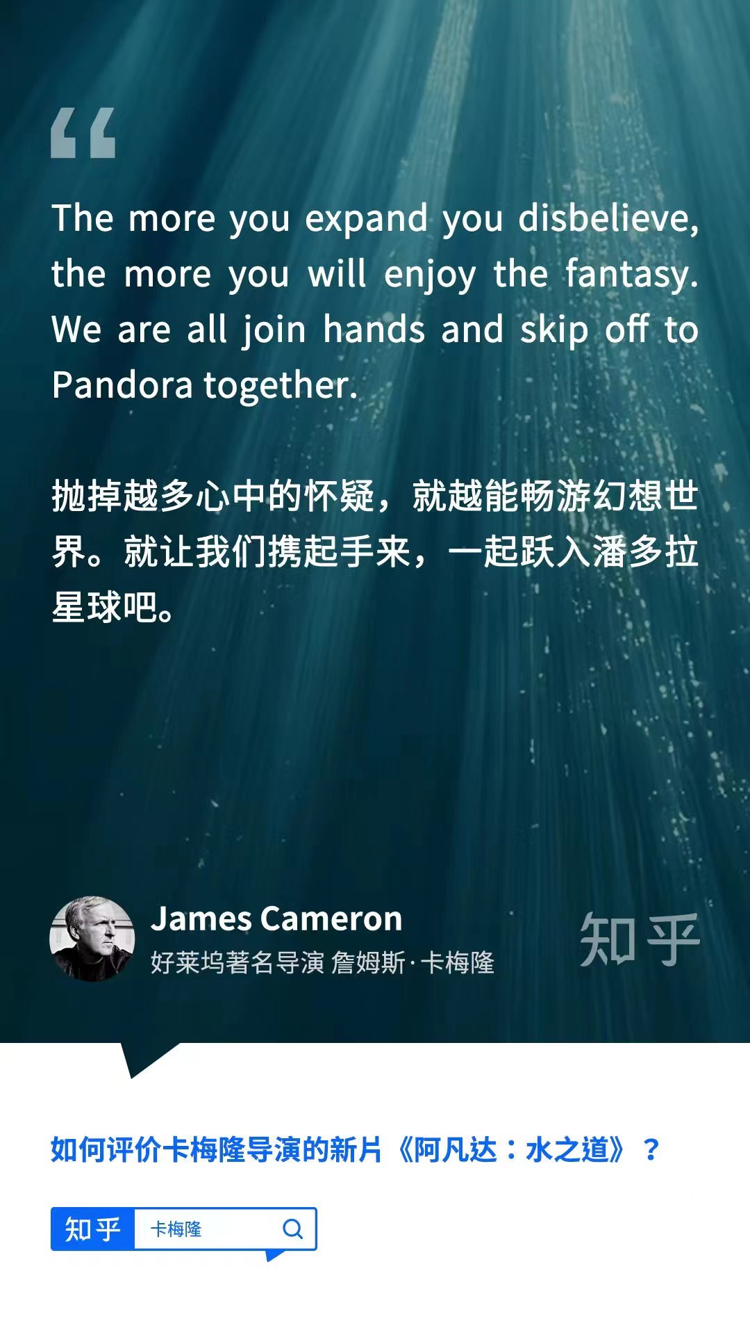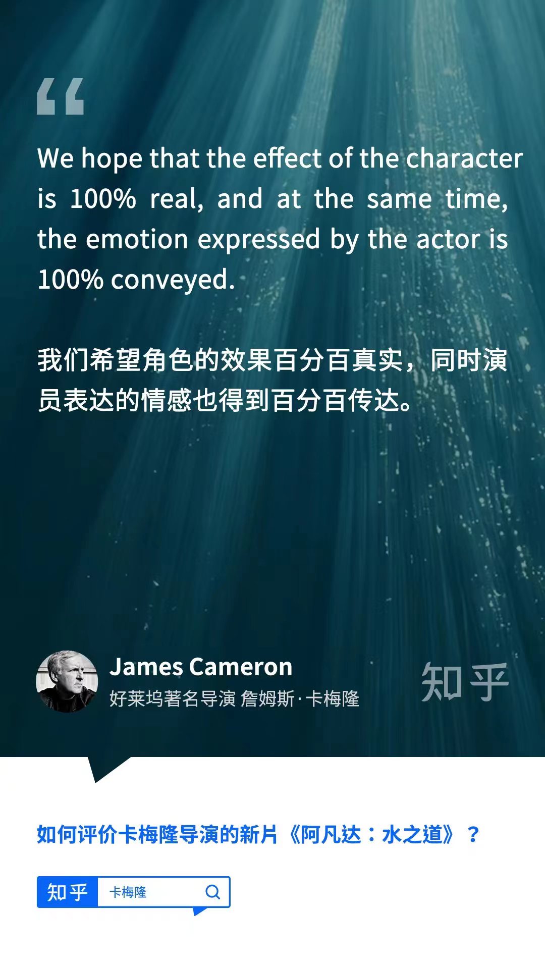 「海洋對我來説意義非凡。甚至在我與海洋未曾謀面之前,我已對海洋充滿熱愛。我在加拿大偏遠的地方學習了水肺潛水,我喜愛它藴含的象徵意義」。導演卡梅隆在知乎反覆表達自己對海洋的特殊情感。他説,潛意識里,我們都認為海洋如同母親,至少通過拍這部電影,我可以從海洋環境保護的角度作出回饋。「《阿凡達2》融合了我畢生兩大摯愛:以畫面敍事的電影和海洋」。