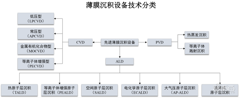 薄膜沉積是指在基底上沉積特定材料形成薄膜,使之具有光學、電學等方面的特殊性能,按工藝原理可分為物理氣相沉積(PVD)、化學氣相沉積(CVD)和原子層沉積(ALD)設備,按設備形態可分為批量式(管式)和空間型(板式)兩種技術路線。