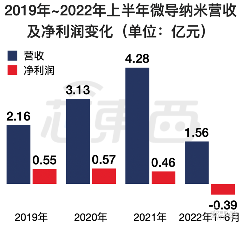 2019年、2020年、2021年、2022年上半年,微導納米的營收分別為2.16億元、3.13億元、4.28億元、1.56億元,淨利潤分別為0.55億元、0.57億元、0.46億元、-0.39億元。