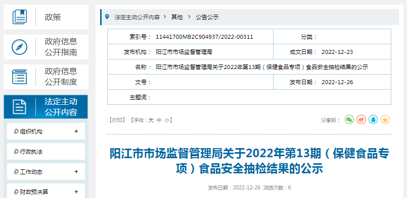 中國質量新聞網訊 近日,廣東省陽江市市場監督管理局發佈關於2022年第13期(保健食品專項)食品安全抽檢結果的公示。