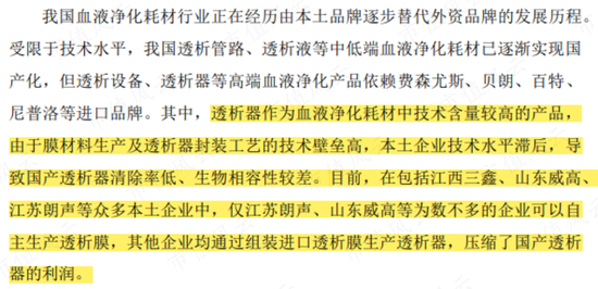 而在耗材領域,公司表示,本土企業技術水平滯后,雖然在透析管路、透析液等中低端耗材領域實現國產化,但僅有威高血液淨化、江蘇朗聲等企業能自主生產透析器當中的透析膜,其他企業都是「組裝廠」。