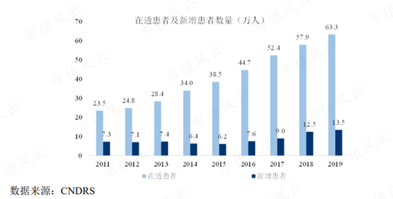據全國血液淨化病例信息登記系統(CNRDS)統計:2016年接受血液透析治療的患者人數為44.7萬人,2019年底已達到63.3萬人,年均複合增長率達12%。