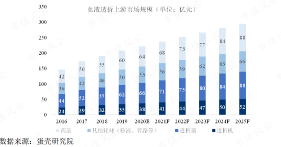 更具體的,根據蛋殼研究院的測算,2020年,透析機、透析器、其他耗材(粉液、管路等)及藥品的市場規模分別在38億元、66億元、53億元及64億元左右。