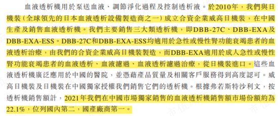 實際上,公司也沒有披露在透析機、透析器等領域的市佔率,只是説透析機產品在2021年公開招標渠道銷售當中「市場佔有率均居前列」。