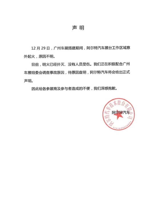 12月29日下午,阿爾特汽車公司發佈聲明,稱其展臺工作區域意外起火,原因不明。阿爾特正在積極配合廣州車展組委會調查事故原因,待原因查明,阿爾特汽車將會給出正式聲明。