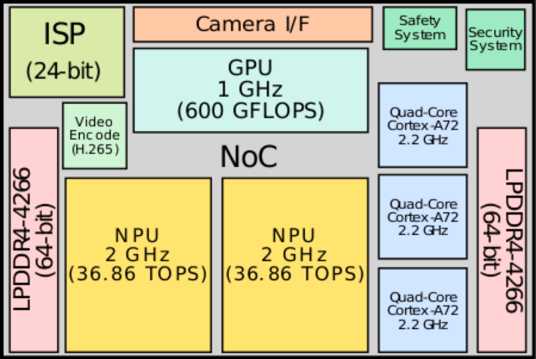 FSD芯片採用三星的14納米工藝。包含 3 個四核Cortex-A72集羣,總共 12 個 2.2 GHz 的 CPU,一個 1 GHz 的 Mali G71 MP12 GPU,2個2 GHz 的神經處理單元,以及各種其他硬件加速器。FSD的圖像處理器能夠提供0.6TFLOPS計算能力,運行頻率為1GHz;2個神經網絡處理器運行在2.2GHz頻率下能提供72TOPS的處理能力。