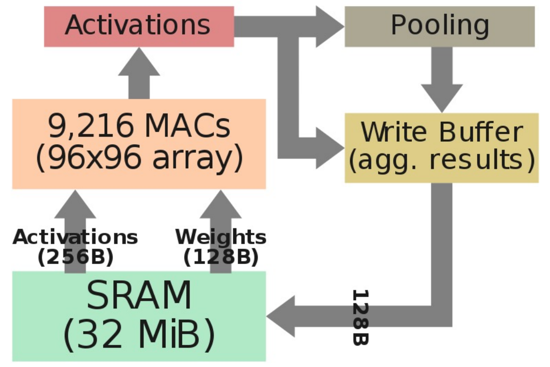 每個周期,NPU從SRAM讀取256字節的激活數據和另外128字節的權重數據到MAC陣列中。每個NPU擁有96x96 MAC,另外在精度方面,乘法為8x8bit,加法為32bit,兩種數據類型的選擇很大程度上取決於他們降功耗的努力。在2GHz的工作頻率下,每個NPU的算力為36.86TOPS,FSD芯片峰值算力為73.7TOPS。在點積運算之后,數據轉移到激活硬件,最后寫入緩存,以匯總結果。FSD支持許多激活功能,包括ReLU、SiLU和TanH。每個周期,將128字節的數據寫回SRAM。所有操作同時且連續地進行,重複直到完成整個計算。