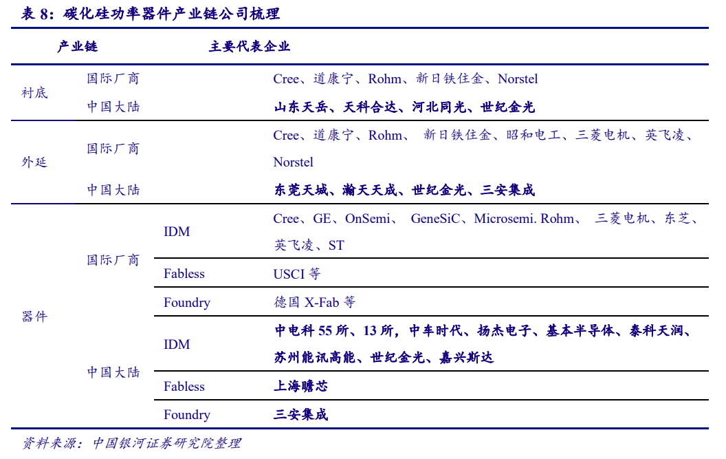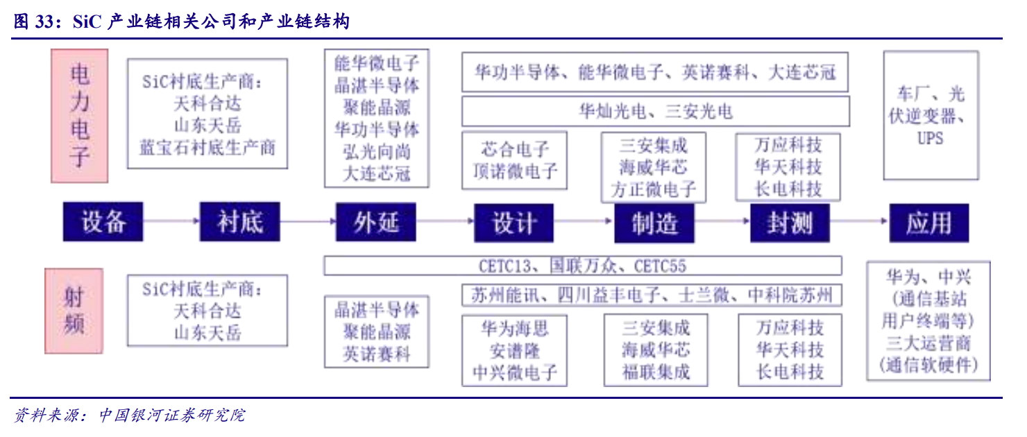 中國銀河證券分析師高峰等12月13日發佈的研報指出,從產業鏈層面初步劃分,整個SiC產業鏈主要分為設備、襯底、外延、設計、器件和封裝模塊,國內多數廠家僅從事產業鏈部分環節,例如天岳先進專注襯底材料的演進,東莞天域和瀚天天成對外延部分研究比較深入,國內多家功率器件企業如三安光電、士蘭微等已入局SiC賽道。