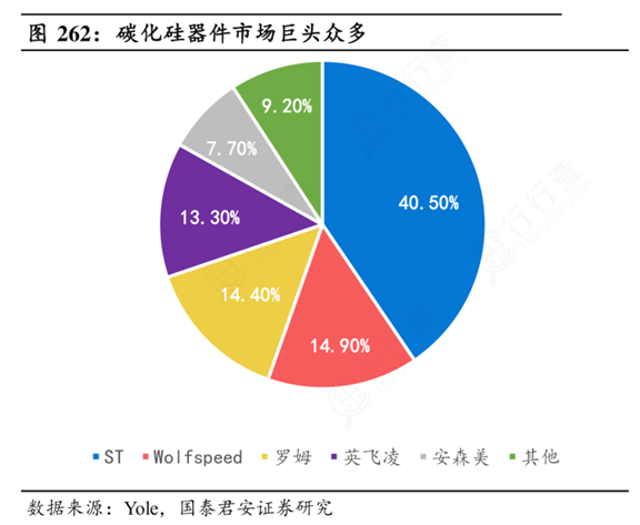 碳化硅器件方面,國泰君安證券分析師王聰等2022年11月16日發佈的研報指出,海外巨頭模式多樣,壟斷全球碳化硅器件市場。根據Yole數據,2020年全球碳化硅功率器件市場份額中,ST為40.5%,Wolfspeed為14.9%,羅姆為14.4%,英飛凌為13.3%,安森美為7.7%。