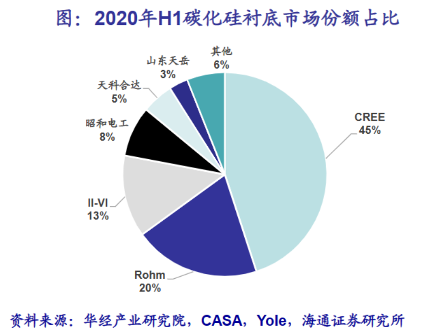 根據華經產業研究院援引Yole數據,2020年上半年,碳化硅襯底市場(半絕緣和導電型)Wolfspeed市佔率達到45%以上,國內龍頭天科合達和天岳先進的合計市場份額不到10%。天岳先進、爍科晶體(中電科孵化)、河北同光(中科院半導體所孵化)現有主要產品為高純半絕緣襯底,而天科合達(中科院物理所孵化)、世紀金光主要產品為導電型襯底。