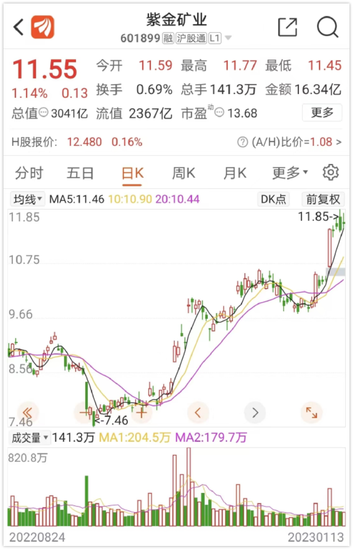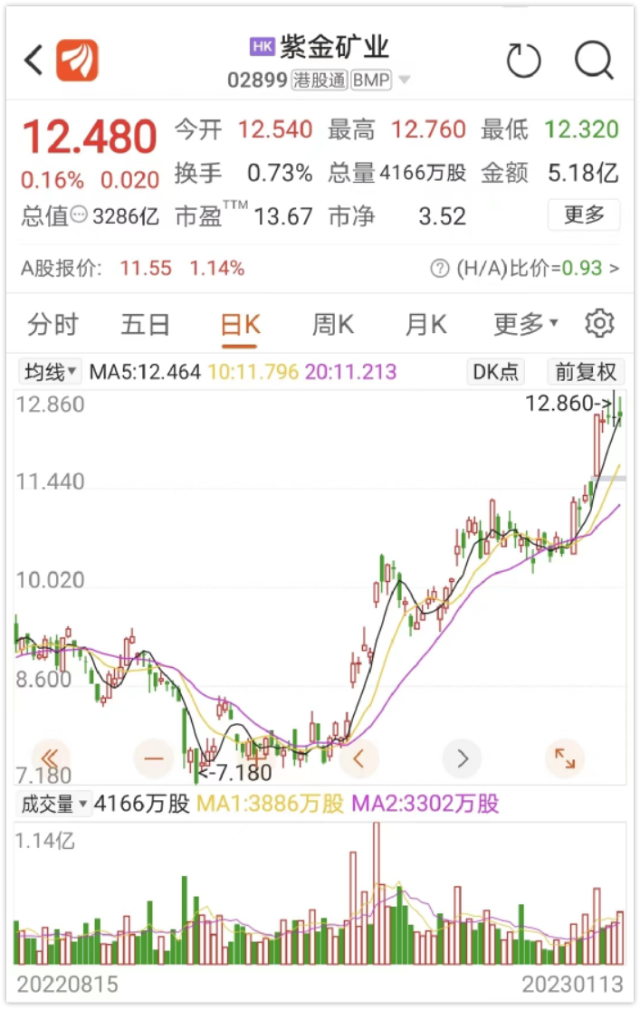 2022年9月底至今,紫金礦業股價持續上行,A股股價最高漲幅達58.8%,H股股價最高漲幅達79.1%,兩者都接近近9個月新高。