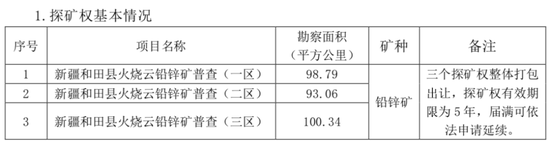 據《新疆和田縣火燒雲鉛鋅礦探礦權出讓招標文件》顯示,礦區設一區、二區、三區,總面積為292.19平方公里。3個探礦權範圍內總礦石量超8000萬噸,估算鉛鋅金屬資源量1922.71萬噸,其中,二區為主礦區, 估算鉛鋅資源量1880.89萬噸,平均品位鋅+鉛27.97%(鋅 23.37%、鉛4.6%),現已發現礦體13個。