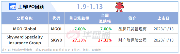 上周共計有兩隻美股新股登陸資本市場,梅西個人服裝品牌管理商MGO Global $MGOL 和保險公司Skyward $SKWD 。MGO Global上演「過山車」行情,開盤暴拉,盤中多次觸發熔斷,漲幅一度飆升至230%!而隨后漲幅逐漸收窄,最終收盤破發,收跌7%,股價報4.65美元。