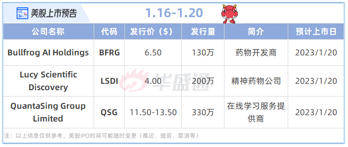 本周美股IPO市場預計將迎來3只新股,均擬在周五(1月20日)掛牌上市,包括多次推迟上市的藥物開發商Bullfrog AI Holdings $BFRG 、精神藥物公司Lucy Scientific Discovery $LSDI 及中概股在線學習服務提供商量子之歌(QuantaSing Group Limited) $QSG 。