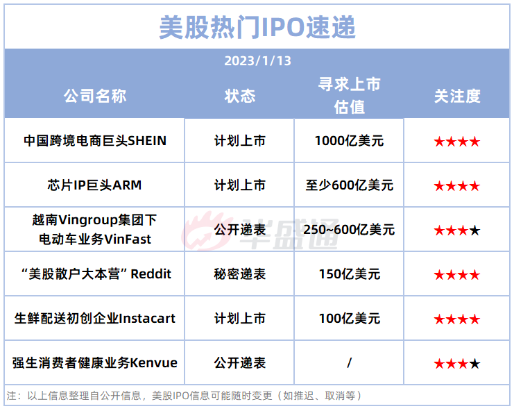 不過關注度較高的公司如下表中的中國跨境電商巨頭SHEIN、「美股散户大本營」Reddit暫時未有新的上市動作。