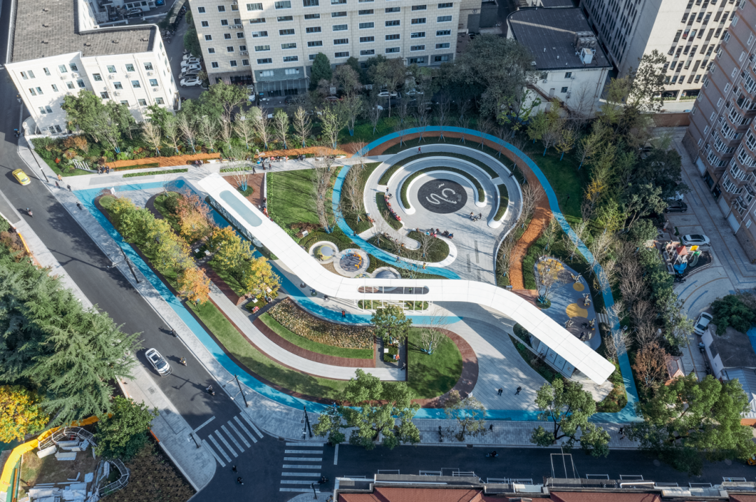 樂山綠地以「山水際會,眾樂之源」為主題,寓意「仁者樂山、智者樂水」,將中國園林的山水觀融於綠地設計中,打開原有圍牆,嵌入周邊居民及商圈白領日常所需,疊加社交、親子、健身、文娛等複合功能,將樂山綠地打造成一個開放式公園綠地,塑造出一個兼具社區歸屬感和現代時尚感的城區景觀,使得居民不必走遠,出門轉角就能遇到「小而美」的口袋公園,滿足居民家門口的日常遊憩健身需求。