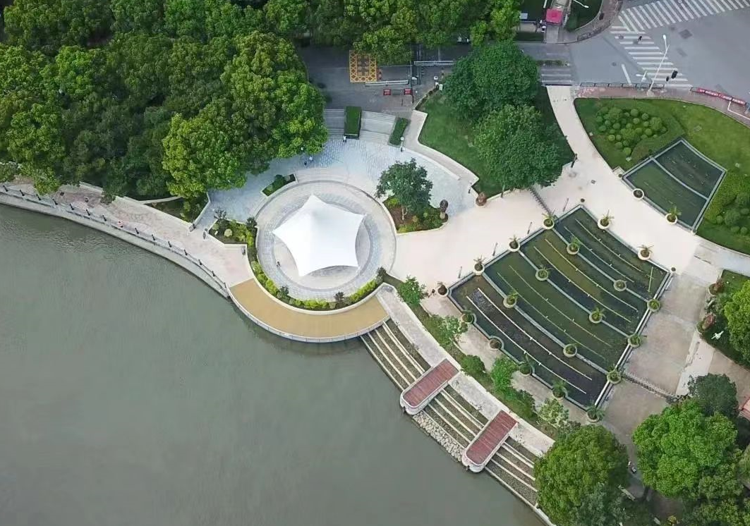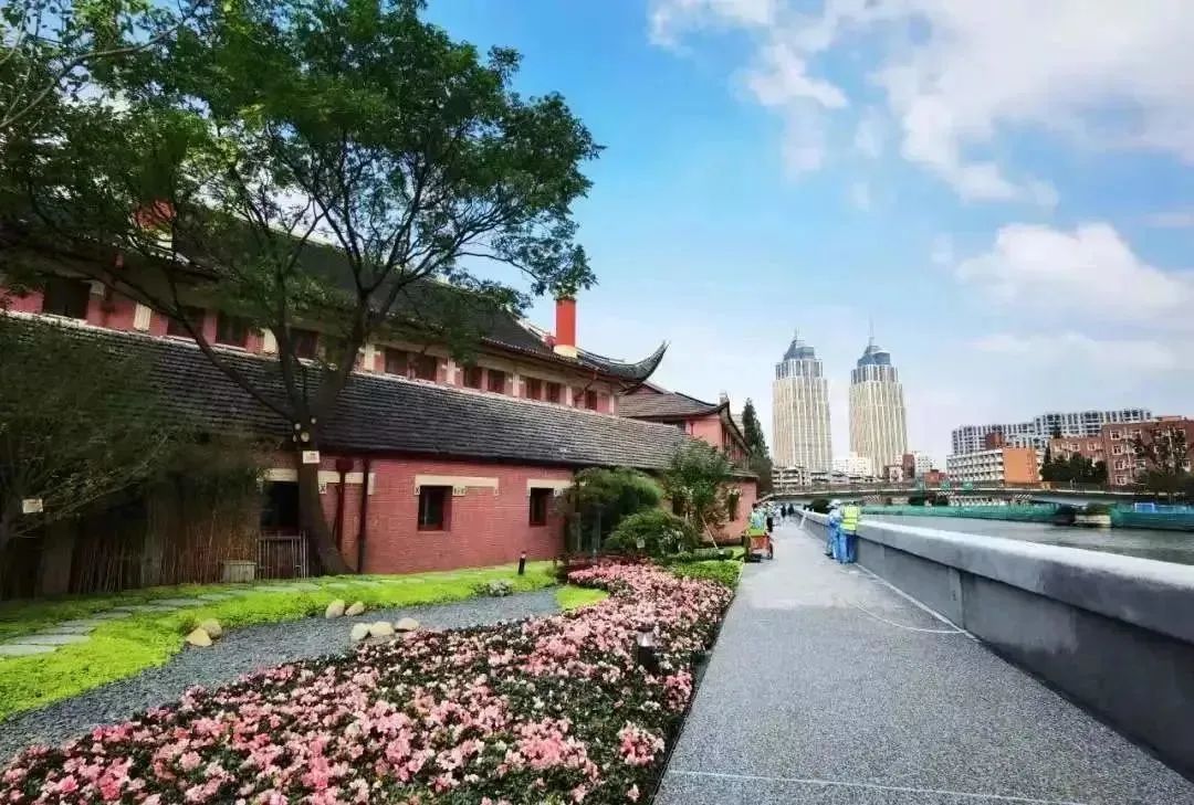 蘇州河華政段長約900米,以濱河慢行步道為連線,串聯起多元、活力、共享的濱河公共空間。沿着華航小區旁的健身步道進入,由東向西,10個人文景觀移步易景。思孟園內搭建了一座拱形花架;格致園以古朴典雅、中西合璧風格的格致樓為依託;倚竹苑鋪設了由西洋鵑等花卉組成的精緻花境,結合校內松、竹、楓等植物,打造了「長寧·蘇河驛站」;獬豸園內有一座典雅中式園林;桃李園周邊有8棟歷史建築圍繞,是「一帶十點」中的「C位」;法劇場將下沉廣場與觀景平臺結合,4張圓弧形大理石凳供市民小坐片刻;銀杏院有一棵135歲上的古銀杏,又移植了8棵小銀杏。步道上的每一個節點處處彰現匠人的精益求精和歷史敬畏。