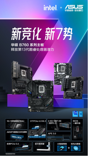 新競化,新7勢,華碩新一代Intel B760系列主板正式發佈!首發型號多達十余款,涵蓋ROG STRIX猛禽、ProArt創藝國度、TUF GAMING電競特工以及PRIME大師四大系列,是打造高質價比新酷睿平臺的好選擇,可滿足不同玩家的需求,充分發揮第13代Intel酷睿處理器的性能。立即搶購盡享華碩B760系列主板帶來的更快、更好的新體驗。同時亮相的還有3款支持DDR5內存的全新華碩Z790主板,分別是華碩Z790吹雪(ROG STRIX Z790-A GAMING WIFI)、ROG STRIX Z790-H GAMING WIFI以及PRIME Z790M-PLUS,不久后即將正式發售。