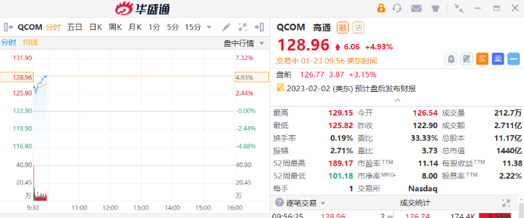 華盛資訊1月23日消息,美股開盤后三大指數持續走高,納指漲幅擴大至1%。明星科技股普漲,高通漲近5%,臺積電漲4%,特斯拉漲超3%,蘋果漲1.5%。