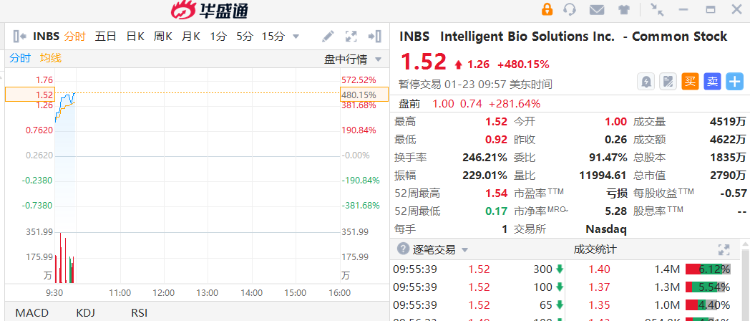 開發和提供智能、非侵入性實時測試解決方案的生命科學公司Intelligent Bio Solutions $INBS 高開高走,截至發稿漲超480%,觸發臨停。