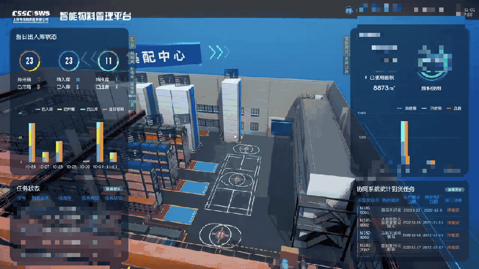 同時,外高橋造船還運用三維孿生場景融合物聯網技術,聯通虛擬與現實,將倉儲場地以三維立體畫面實景映射,即時反映倉庫動態影像。倉儲管理人員只需坐在電腦前,就能夠直觀地觀察到貨、雲開箱、入庫、分揀出庫等關鍵操作流程,實現物資物流信息的動態可視化,讓倉儲管理「一目瞭然」。