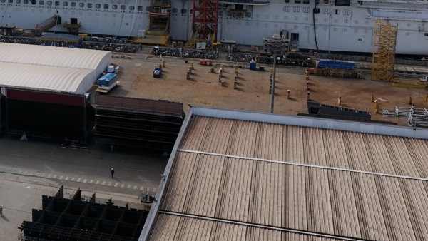 距離出塢還有一百多天。在國內大型郵輪首制船(H1508)內,三千多名工人正在抓緊時間施工。站在船尾甲板向長江望去,正在如火如荼建設中的各種大型船隻填滿了視野。