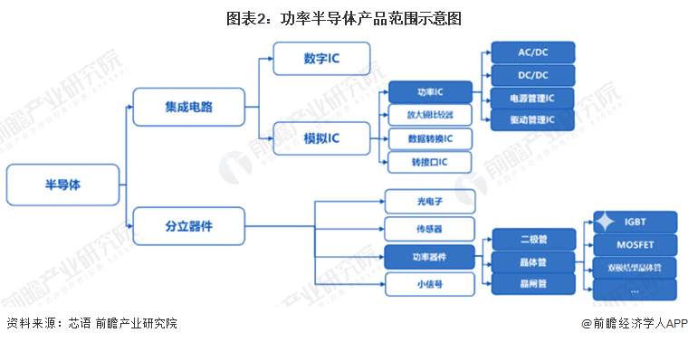 功率半導體按器件集成度可以分為功率分立器件和功率IC兩大類。本文所指IGBT芯片是指具有獨立功能的,用於實現功率轉換的芯片產品,是IGBT分立器件的核心組成部分,經封裝后成為IGBT單管、IGBT模組等。