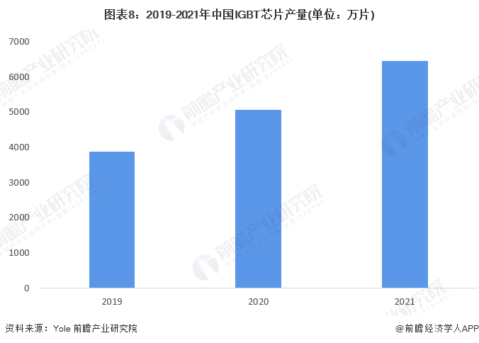 根據Yole的數據顯示,2019-2021年我國IGBT行業的產量分別為1550萬隻、2020萬隻、2580萬隻。考慮到IGBT行業主要產品是模塊,而模塊主要採用多個IGBT芯片並聯方式,模塊內IGBT芯片用量主要與整體電流、電壓規格相關;且我國IGBT廠商部分芯片採購於英飛凌等國際巨頭,並非完全自產自銷,綜上,若以1:2.5的比例測算,2021年我國IGBT芯片產量約為6450萬片。