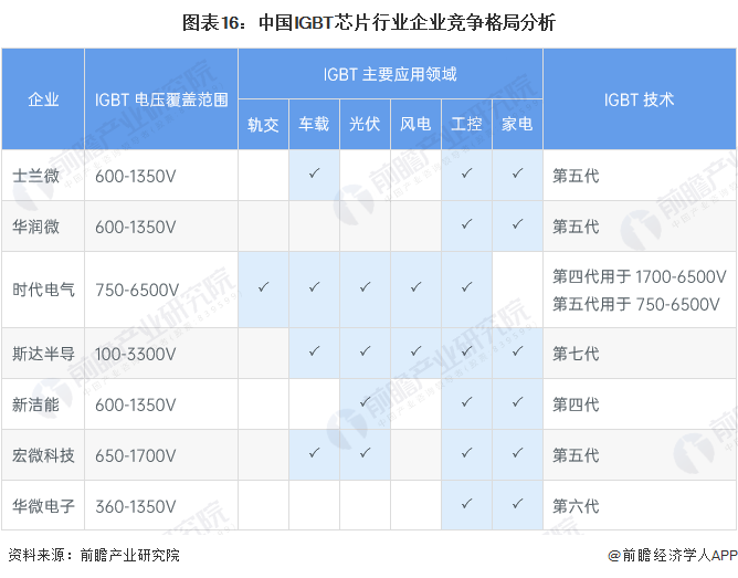 中國IGBT芯片行業代表性企業從技術格局來看,斯達半導應用第七代IGBT技術,電壓覆蓋範圍為100-3300V;華微電子佈局第六代IGBT技術,電壓覆蓋範圍為360-1350V;士蘭微、時代電氣、宏微科技應用第五代IGBT技術;新潔能主要應用第四代IGBT技術。