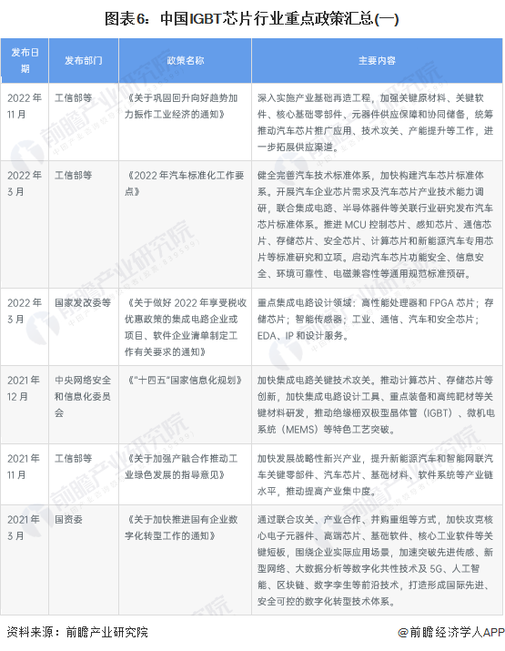 中國IGBT芯片相關政策規劃較為豐富,在眾多國家頂層政策規劃文件中均有所涉及。如2021年11月發佈的《「十四五」國家信息化規劃》中明確指出,加快集成電路關鍵技術攻關。推動計算芯片、存儲芯片等創新,加快集成電路設計工具、重點裝備和高純靶材等關鍵材料研發,推動絕緣柵雙極型晶體管(IGBT)、微機電系統(MEMS)等特色工藝突破。