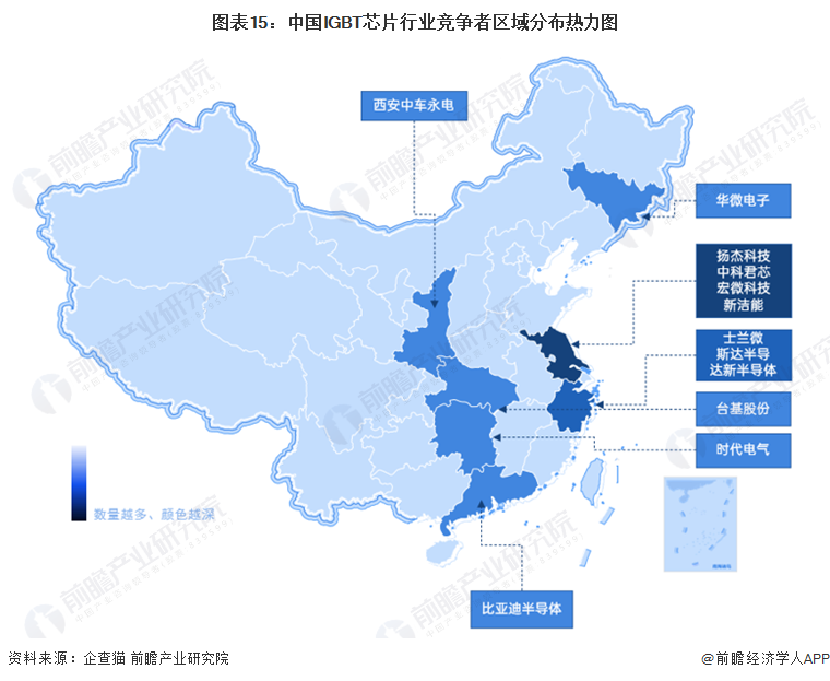 從中國IGBT行業競爭者區域分佈狀況來看,以江蘇、浙江為代表的長三角地區代表性企業數量最多,代表性企業如士蘭微、斯達半導等。其他行業內代表企業分佈較為分散,如華微電子位於吉林;時代電氣位於湖南;比亞迪半導體位於廣東等。