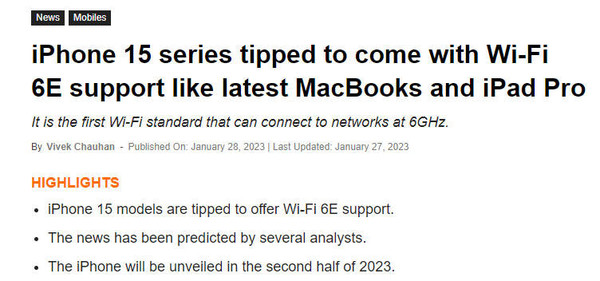 【手機中國新聞】iPhone 15系列將在今年秋季發佈,目前網上已經有不少關於該系列新機相關的爆料。近日,知名蘋果分析師郭明錤表示,即將推出的iPhone 15系列將採用WiFi 6E標準。這與巴克萊分析師Blayne Curtis和Tom O'Malley最近的預測一致。但是,他們沒有具體説明哪些型號將配備該功能。