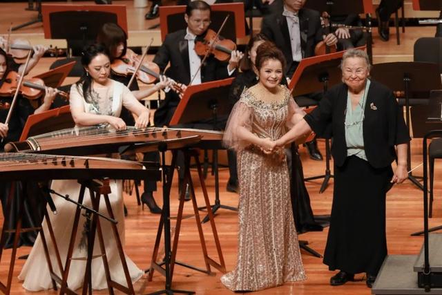 2018年11月,吳碧霞(中)和古箏名家高雁(左)、指揮家鄭小瑛(右)在琴臺音樂廳同台演出。