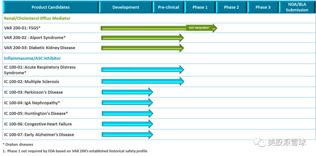 VAR 200:一種用於治療腎臟疾病的膽固醇外排介質,可去除過多的腎臟膽固醇和脂質,減緩疾病進展,目前推進的試驗主要用於治療局灶性節段性腎小球硬化症 (FSGS)、Alport綜合徵和糖尿病腎病,其中治療FSGS的試驗即將開展臨牀二期;